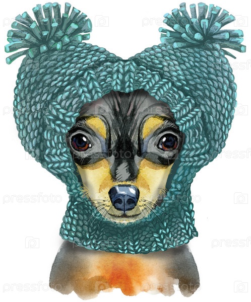 Милая собака в зеленой шляпе. Графика на футболке с собакой. Иллюстрация акварельного той-терьера