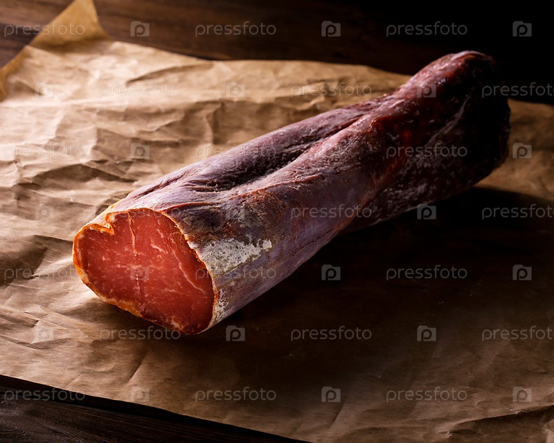 Испанский мясной деликатес из свиного сыровяленого карбоната на деревенском фоне