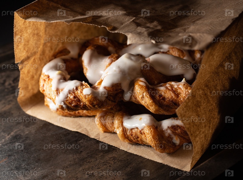 Свежая выпечка в крафтовом бумажном пакете. Темный фон