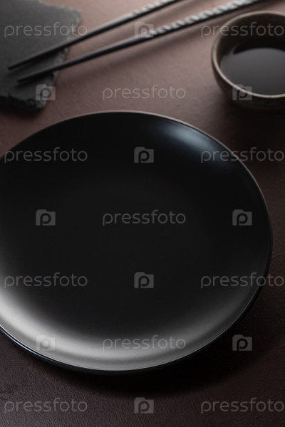 Темная пустая тарелка без еды и палочек, вид сверху