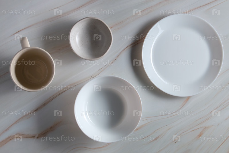 Светлые пустые тарелки без еды на светлом мраморном фоне, плоская планировка, вид сверху