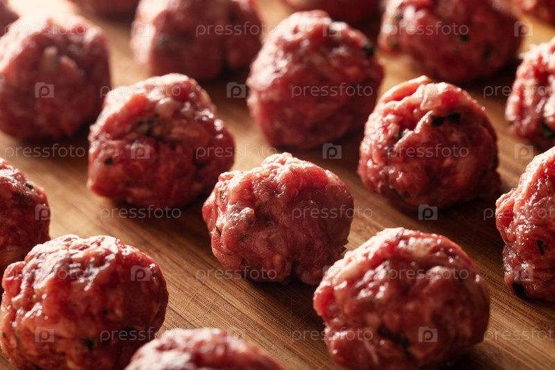 Сырые неприготовленные фрикадельки на деревянной разделочной доске