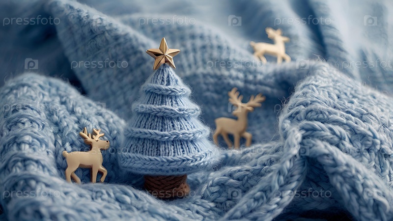 Рождественская открытка. Вязаная нежно-голубая елка на фоне вязаного синего пледа. Вязание, поделки, украшения ручной работы