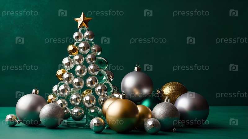 Открытка на Новый год, Рождество. Современная альтернативная новогодняя елка из серебряных, зеленых, золотых елочных шаров на зеленом фоне