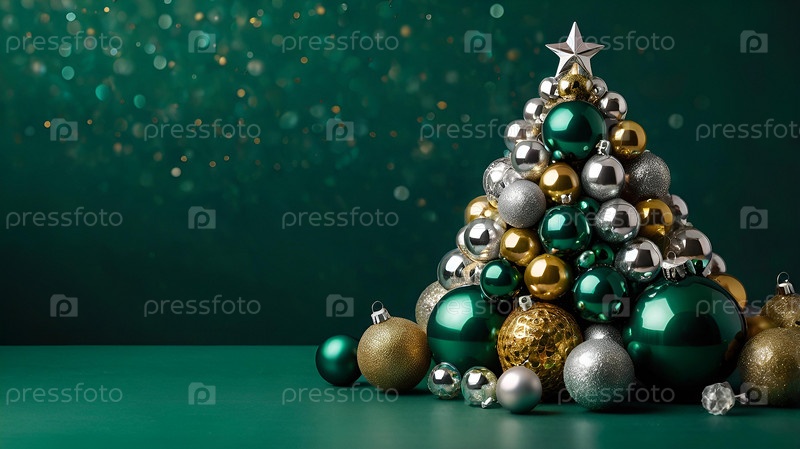 Открытка на Новый год, Рождество. Современная альтернативная новогодняя елка из серебряных, зеленых, золотых елочных шаров на зеленом фоне