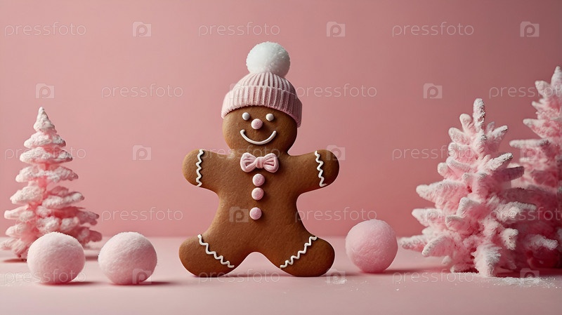 Домашние рождественские пряники с глазурью. Вкусные пряники на фоне сахарной ваты деревьев на розовом фоне. Свежеиспеченные рождественские пряники
