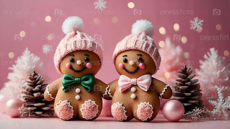 Домашние рождественские пряники с глазурью. Вкусные пряники на фоне рождественских елок на розовом фоне. Свежеиспеченные рождественские пряники