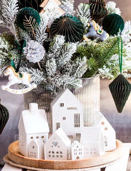 Еловый букет с зелеными бумажными игрушками, лошадь и белые скандинавские домики на столе в гостиной. Новогодний декор в интерьере. Концепция подготовки к новогоднему празднику