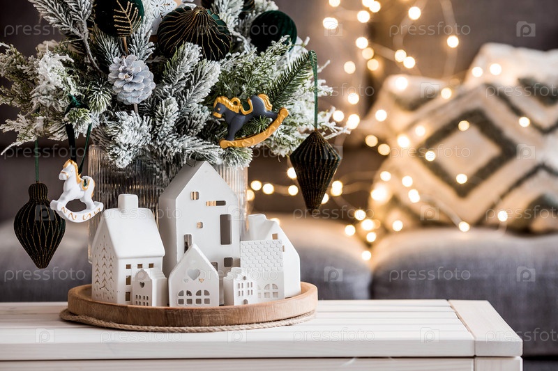 Еловый букет с зелеными бумажными игрушками, лошадь и белые скандинавские домики на столе в гостиной. Новогодний декор в интерьере. Концепция подготовки к новогоднему празднику