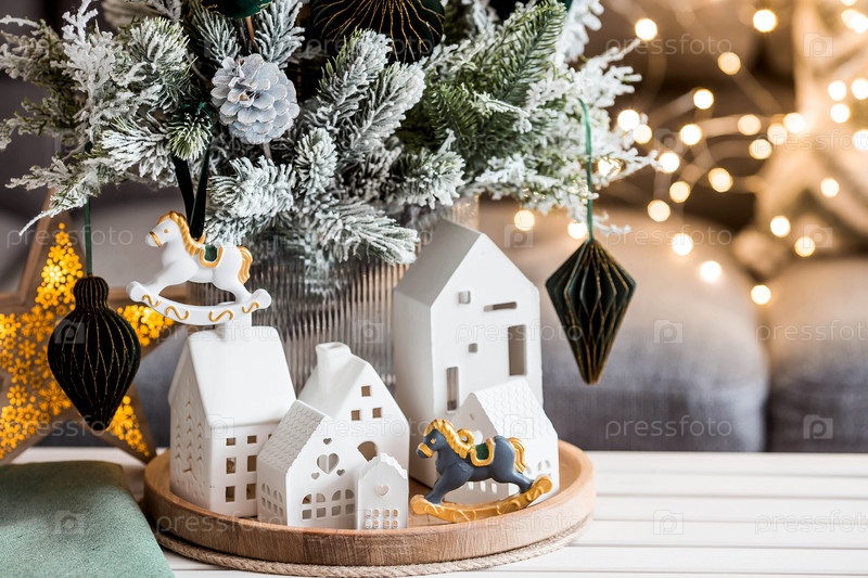 Еловый букет с зелеными бумажными игрушками, лошадь и белые скандинавские домики на столе в гостиной. Новогодний декор в интерьере. Концепция подготовки к новогоднему празднику