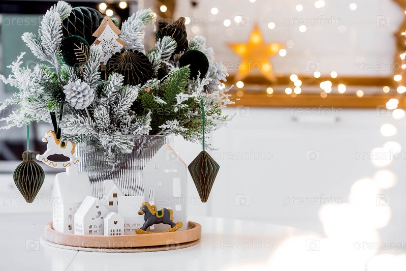 Еловый букет с зелеными игрушками и белыми скандинавскими домиками на кухонном столе. Рождественские украшения в интерьере. Концепция подготовки к новогоднему празднику 2025