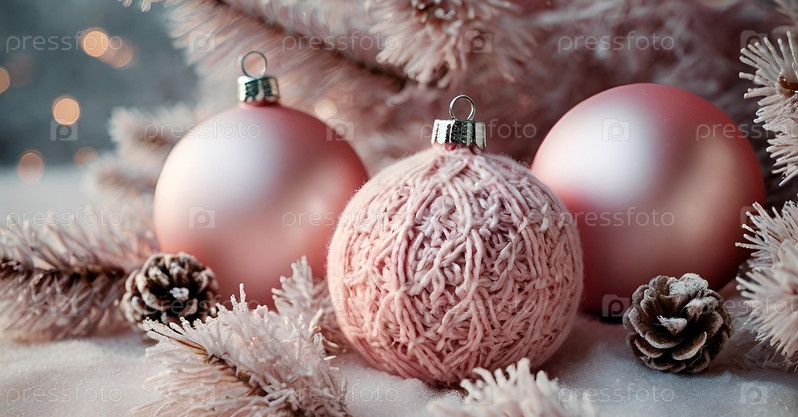 Красивые рождественские розовые шары и еловые ветки на светлом фоне. Падает снег. Традиционные рождественские и новогодние украшения