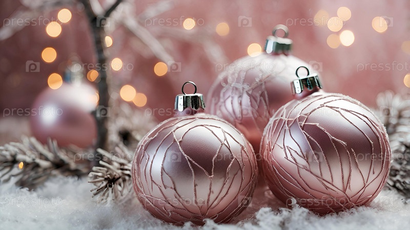 Красивые рождественские розовые шары и еловые ветки на светлом фоне. Падает снег. Традиционные рождественские и новогодние украшения