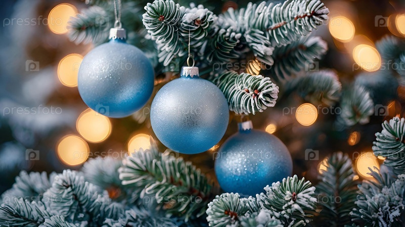Красивые рождественские синие шары и еловые ветки на светлом фоне. Падает снег. Традиционные рождественские и новогодние украшения