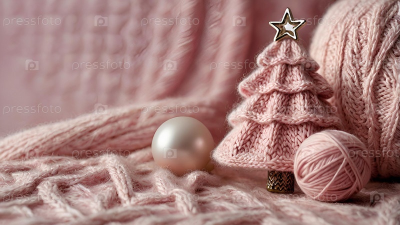 Рождественская открытка. Вязаная нежная розовая елочка на фоне вязаного розового пледа. Вязание, рукоделие, украшения ручной работы