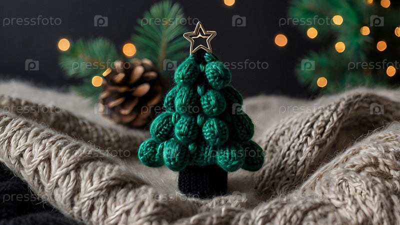 Рождественская открытка. Вязаная зеленая елочка на фоне вязаного пледа. Вязание, рукоделие, украшения ручной работы