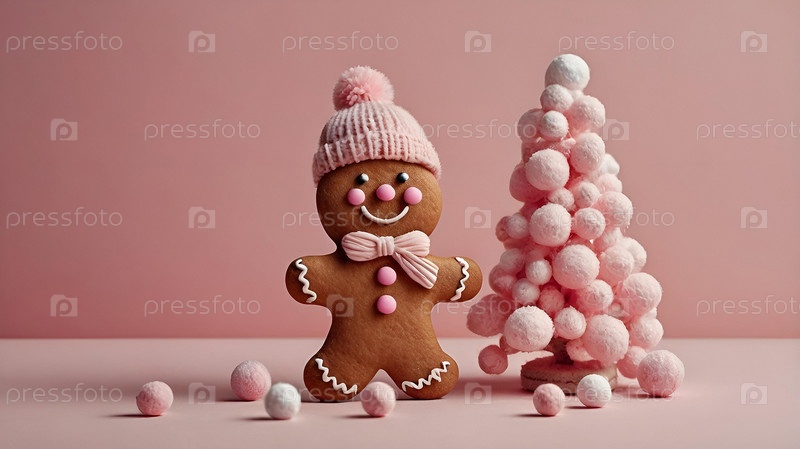 Домашние рождественские пряники с глазурью. Вкусные пряники на фоне сахарной ваты деревьев на розовом фоне. Свежеиспеченные рождественские пряники