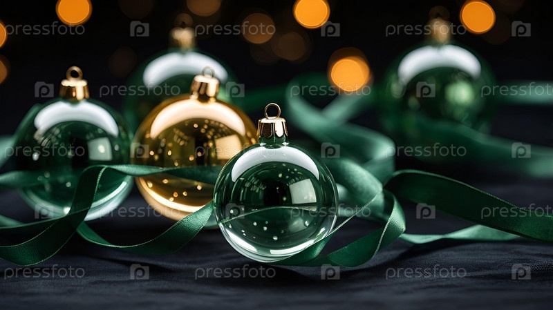 Открытка на Новый год, Рождество. Блестящие елочные шары из прозрачного стекла висят на зеленых лентах на темном фоне