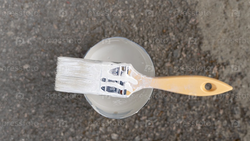 Кисть находится в банке с белой краской