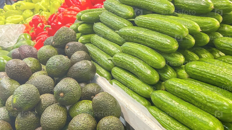 Куча зеленых огурцов лежит на куче зеленых авокадо