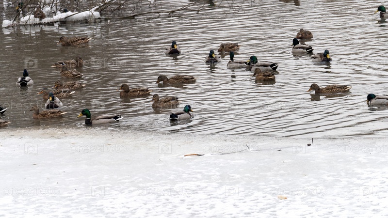 Стая уток плавает в озере