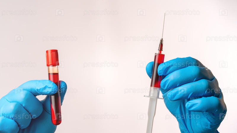 Человек держит шприц и образец крови
