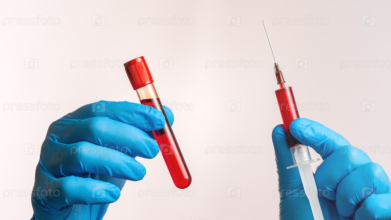 Человек держит шприц и образец крови