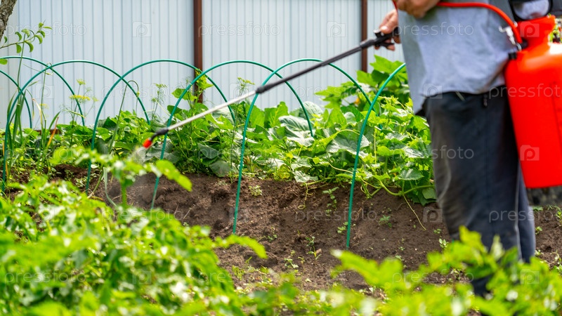 Обработка растений ручным опрыскивателем в саду, борьба с вредителями, Мужчина обрабатывает растения в саду от вредителей