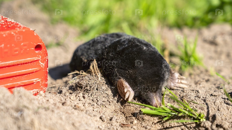 Крот лежит в грязи рядом с красным контейнером