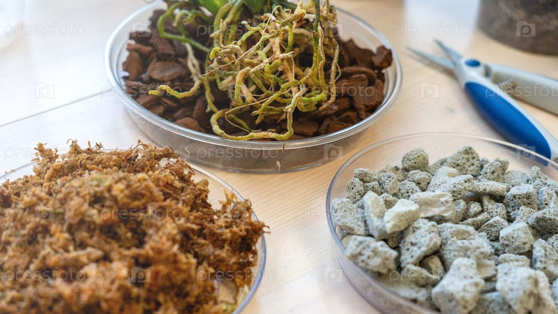 Пересадка орхидей, женщина пересаживает комнатные растения, за комнатными растениями легко ухаживать, Красивое растение орхидеи пересажено в новую почву из сосновой коры на фоне деревянного стола