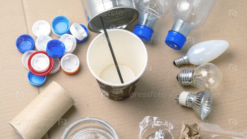 Куча мусора с банкой газировки и чашкой кофе наверху