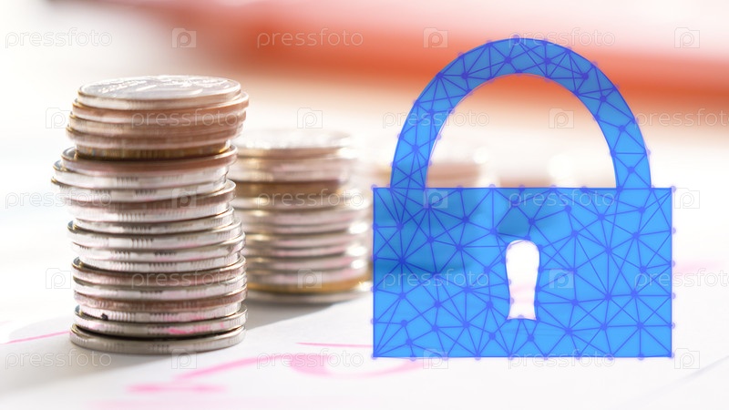 Стопка монет и синий замок