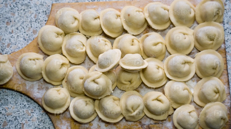 Домашние пельмени крупным планом, пельмени ручной работы на деревянной доске, выборочный фокус, тонированное изображение, традиционное русское блюдо