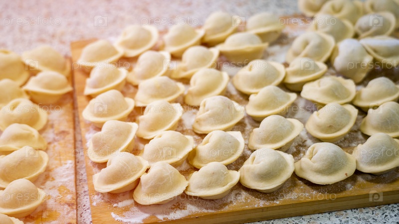 Домашние пельмени крупным планом, пельмени ручной работы на деревянной доске, выборочный фокус, тонированное изображение, традиционное русское блюдо