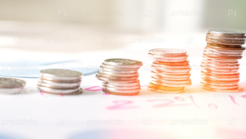 Стопка монет на столе с синим листком бумаги под ними
