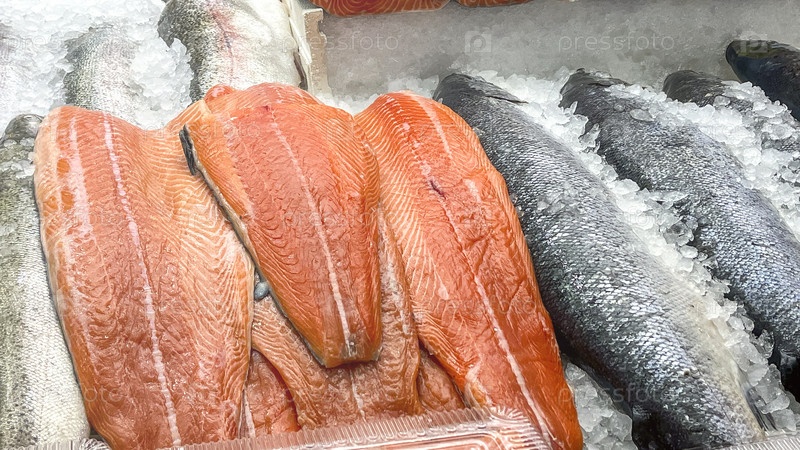 Выставка рыбы на рынке, включая лосося и треску