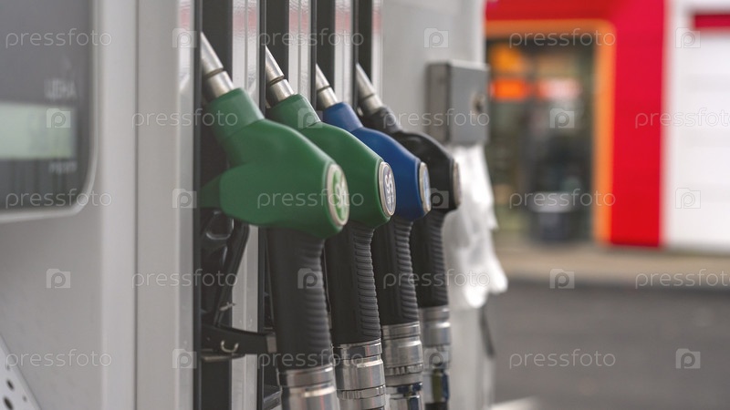 Автозаправочная станция с четырьмя колонками, одна из которых зеленая
