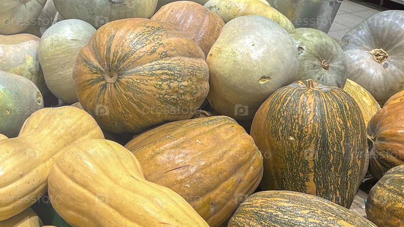 Куча тыкв, некоторые из которых зеленые, а некоторые оранжевые