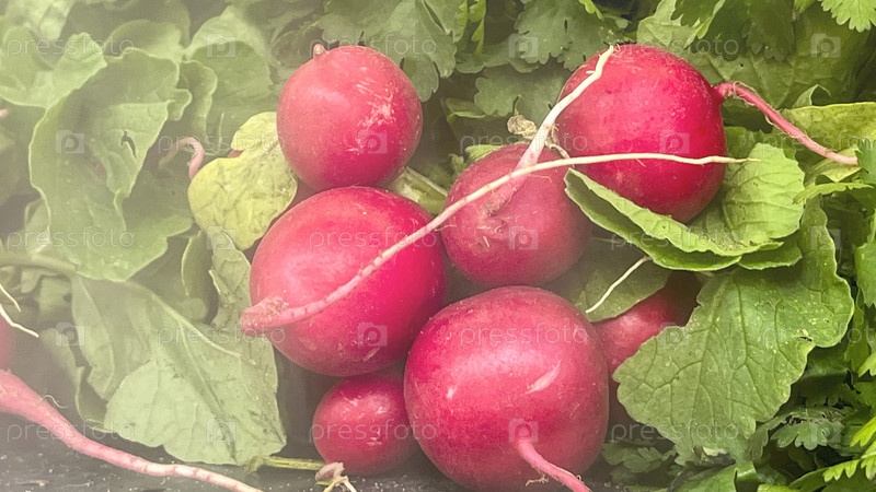 Пучок красной редьки на зеленых листьях