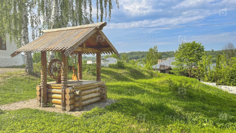Деревянный колодезный дом стоит посреди пышного зеленого поля