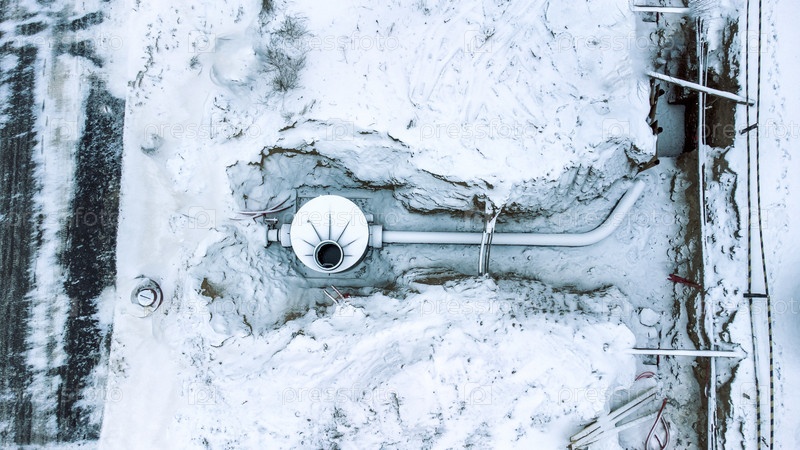 Инженерные коммуникации зимой вид сверху, концепция аварии теплоснабжения в мороз, размораживание системы отопления, аварийная ситуация, селективный фокус тонированное изображение, солнечный блик