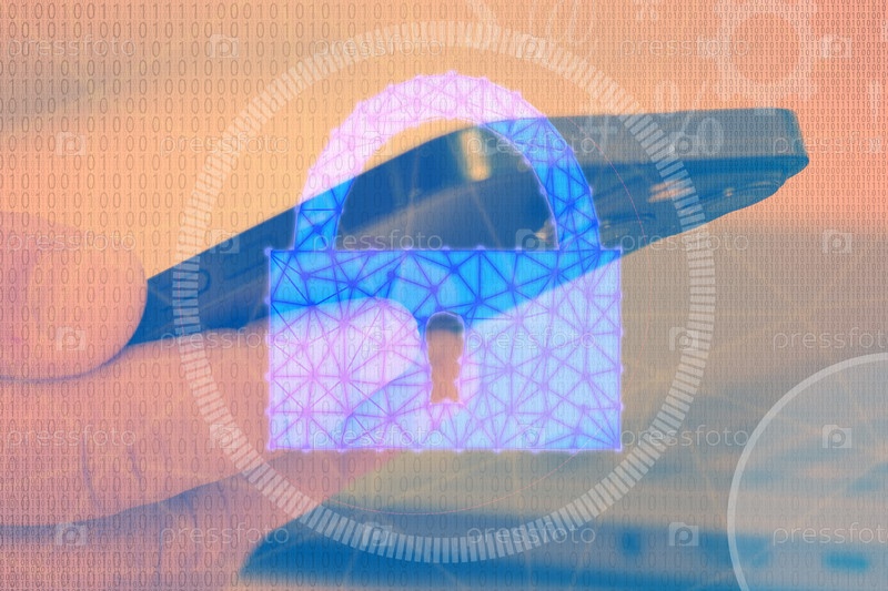 Человек держит мобильный телефон с синим замком на нем