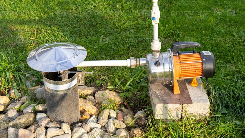 Насос подключен к трубе на травянистой территории