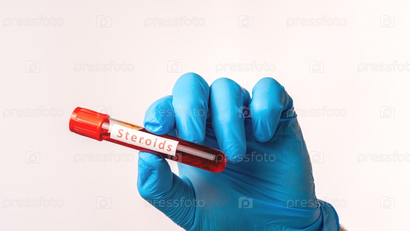 Человек держит в руках красную пробирку с образцом крови, на которой написано слово «Стероиды»