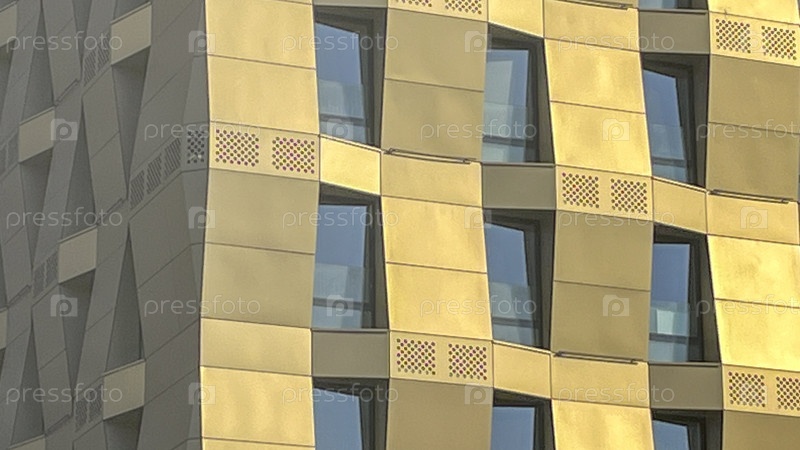 Здание имеет золотистый цвет и много окон