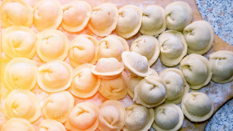 Домашние пельмени крупным планом, пельмени ручной работы на деревянной доске, выборочный фокус, тонированное изображение, традиционное русское блюдо