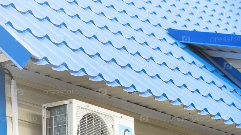 Синяя крыша с синей отделкой и белым кондиционером на крыше