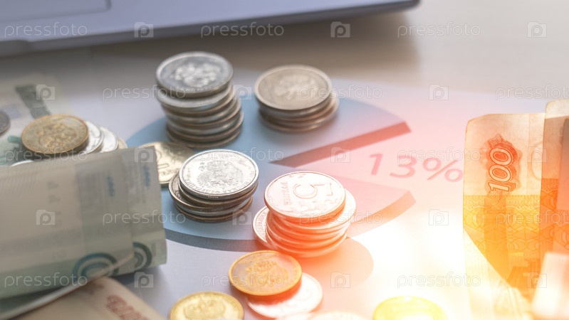 Куча монет и купюр на столе с круговой диаграммой