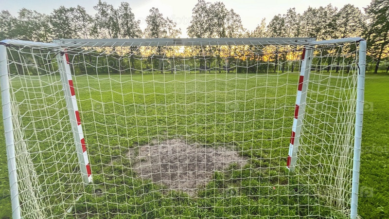 Футбольные ворота пусты, а трава зеленая
