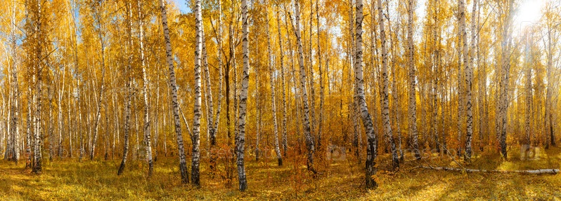 Осенний красочный пейзаж березового леса. Сезонная погода. Золотой листопад. Большое панорамное изображение. Можно использовать как фотообои